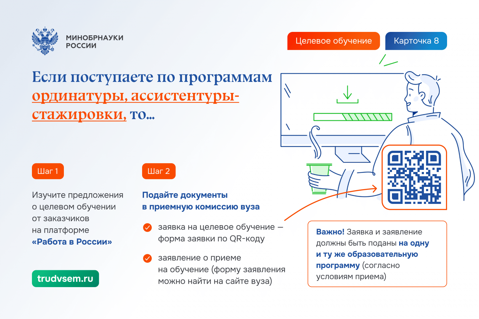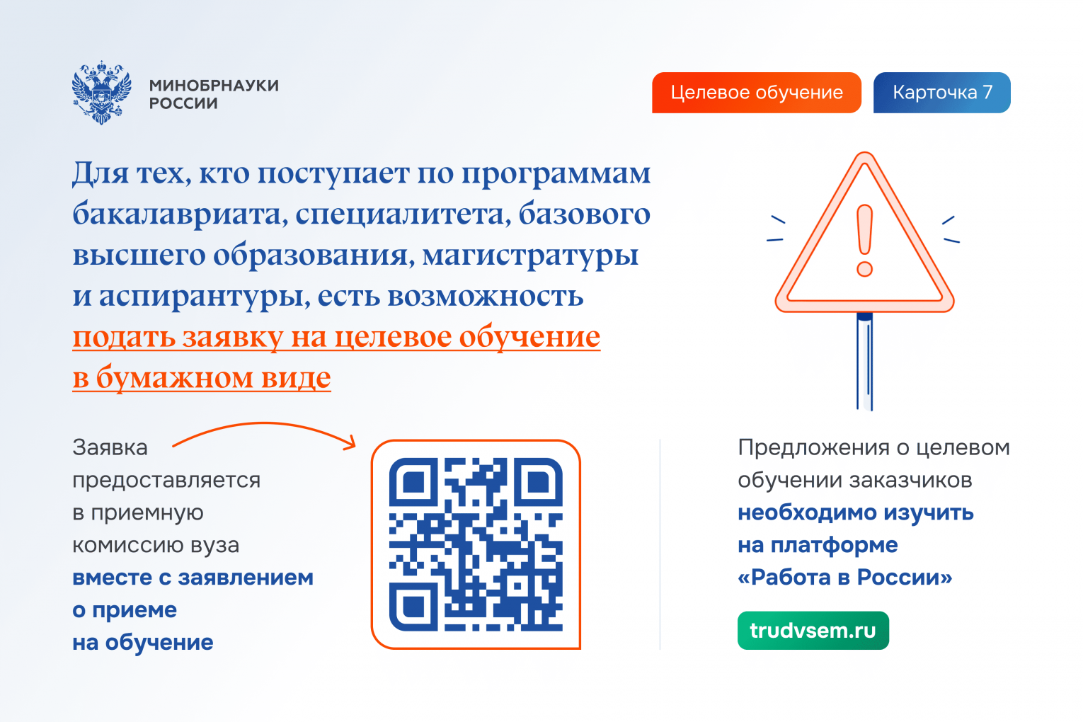 - если гражданин подает заявление о приеме на обучение непосредственно в вуз (лично, по почте или через информационную систему вуза), то он должен самостоятельно ознакомиться с предложениями заказчиков на Единой цифровой платформе в сфере занятости и трудовых отношений «Работа в России» и подать заявку на заключение договора о целевом обучении в вуз в период приема заявлений о приеме на обучение, то есть с 20 июня до 25 июля.